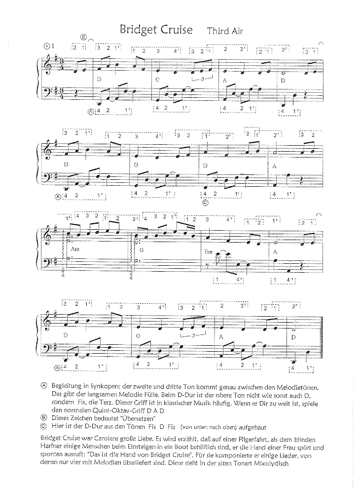 Turlough O’Carolan (1670 – 1738) ist der berühmteste Harfner Irlands. In seinen Kompositionen verschmelzen keltische und barocke Elemtente zu einer eigenen Form irischer Musik, die weder Folk noch Klassik ist. Da seine Musik größtenteils ohne Begleitung überliefert ist, wurden sie hier im modernen Stil mittelschwer arrangiert. Akkordsymbole ermöglichen auch leichtere Begleitungen.