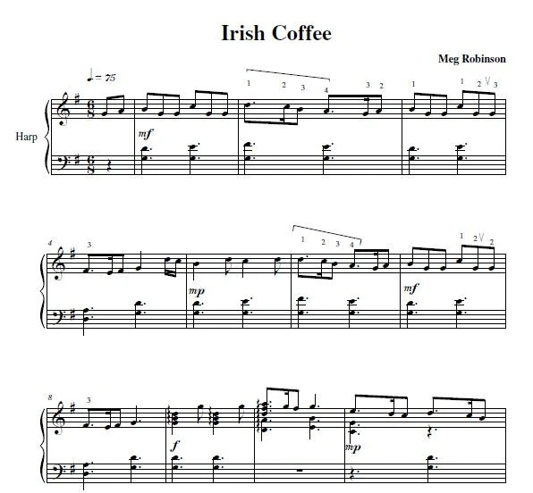 Das Notenheft IRISH COFFEE von MEG ROBINSON enthält ein lebhaftes Stück für Harfe mit Ohrwurmcharakter.